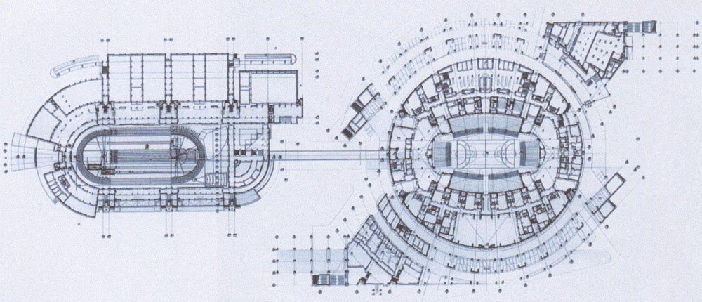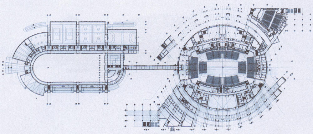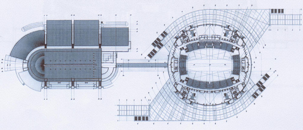 πλαισιώνεται από προθερμαντήρια, κέντρο τύπου, φουαγιέ θεατών, βοηθητικούς