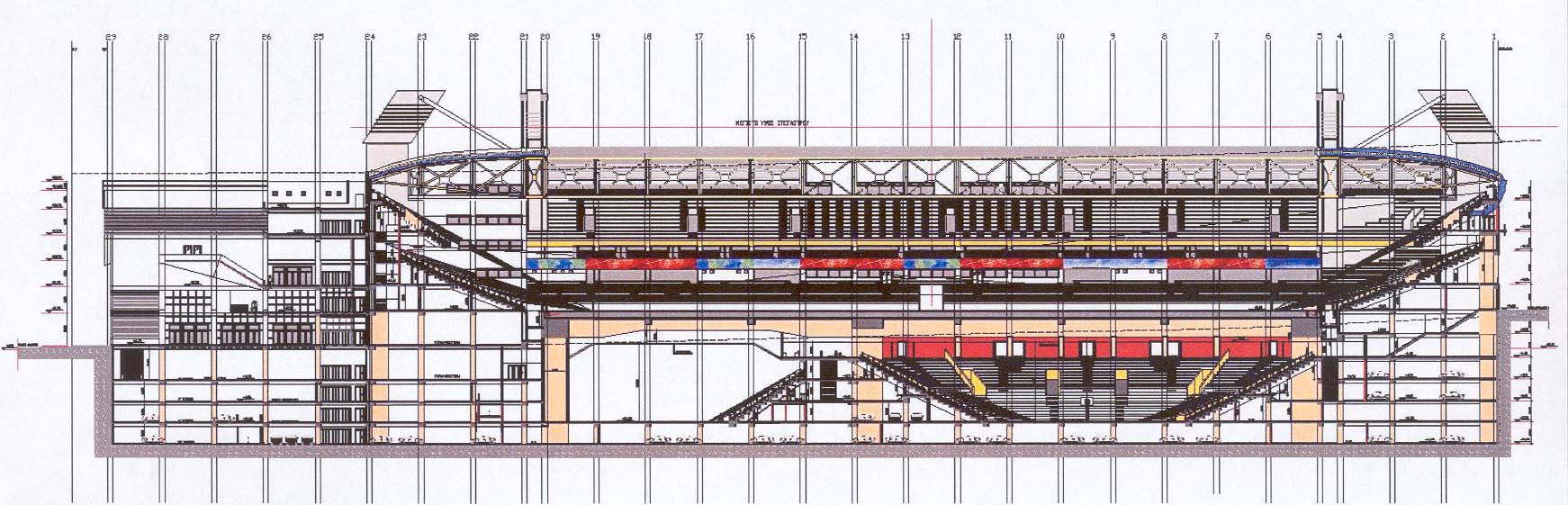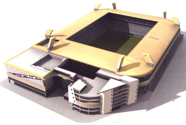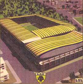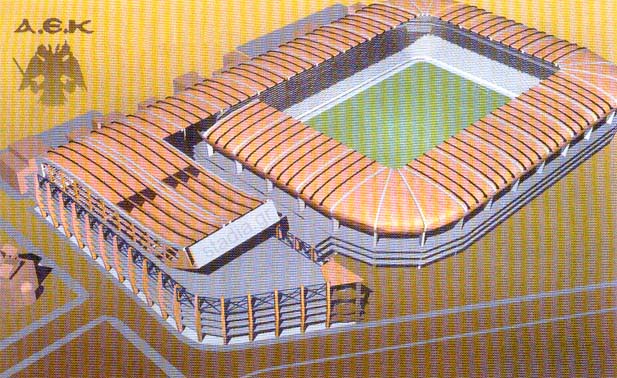 γήπεδο με τα δύο του διαζώματα και απο κάτω τα κλειστά μπάσκετ (δεξιά)