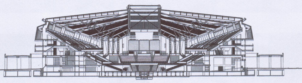 πλαισιώνεται από προθερμαντήρια, κέντρο τύπου, φουαγιέ θεατών, βοηθητικούς